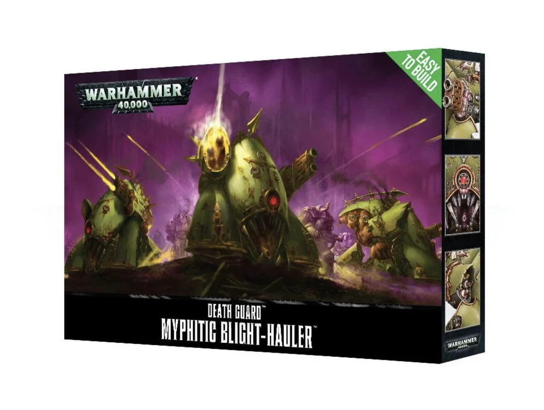 Powering into battle on a trio of articulated track units, the Myphitic Blight-hauler is a light Daemon Engine that provides the Death Guard with heavy firepower wherever it is needed. Resembling a Bloat-drone that has been stripped of its turbines, this strange machine has heavy weapons mounted on its carapace, and its rusting armoured plates can absorb impressive punishment – as can its blubbery exposed flesh-parts, which soak up appalling trauma.