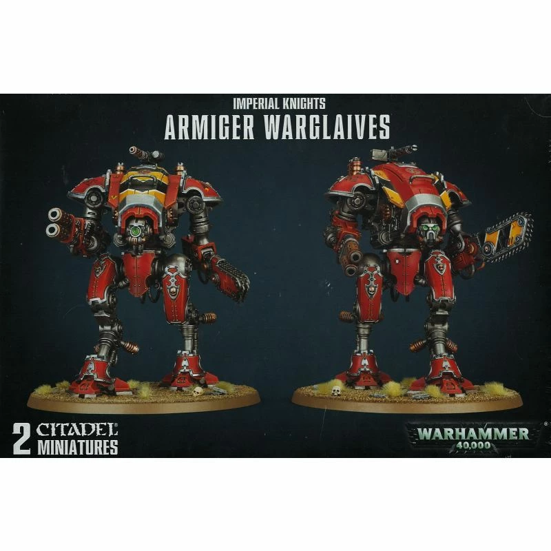 This multi-part plastic kit contains the components necessary to assemble 2 Armiger Warglaives. Smaller and more lightly armoured than their larger Imperial Knight brethren, standing at around half the height, they nevertheless share a lot of details – the basic shape of these bipedal weapon platforms are similar to a standard Imperial Knight, with 2 weapon arms, hydraulically-driven legs, tilting plate and a large carapace surrounding the central head of the suit. Another detail in common with those larger suits is their loadout; for their diminutive size they’re incredibly powerful. Each is armed with a reaper chain-cleaver, thermal spear and a carapace-mounted heavy stubber, the latter of which can be replaced with a meltagun. 4 unique heads are supplied in the kit, and both weapons (which feature articulation at the shoulder) and legs can be attached to either side of the model, allowing for some customisation of pose.