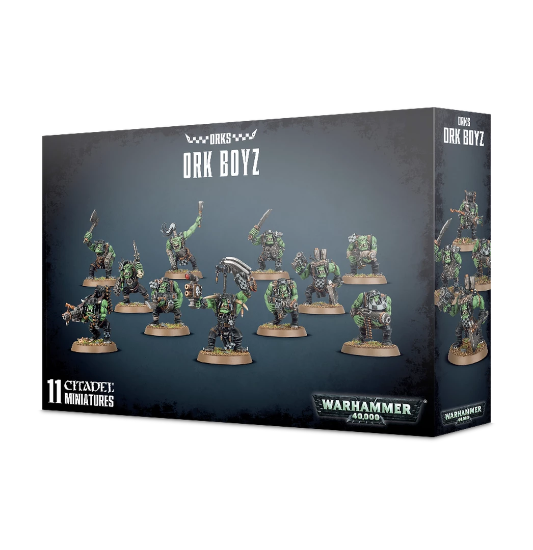 This boxed set contains 11 multi-part plastic Ork Boyz, and includes options for sluggas, choppas, shootas, heavy weapons and stikk bombz. Models supplied with 32 mm round bases.