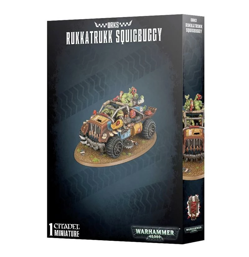 This multipart plastic kit contains the components necessary to assemble a Rukkatrukk Squigbuggy. Notably rugged in construction for an Ork vehicle – while still bearing the ramshackle hallmarks of a machine built by Meks with more hammers than sense – the Squigbuggy is a flatbed truck with a long, wide wheelbase, which allows it to zoom over rough terrain mostly without flipping over disastrously. The flatbed itself contains a squig pen overflowing with all manner of bitey, bile and boom squigs, overseen by a grot (who, honestly, is having a pretty hard time keeping the squigs under control). A large Ork balances precariously by the pen, stuffing a squig into the heavy squig launcher he’s wrestling into position. Below the flatbed are 2 fuel tanks – not especially well protected from impact – and a set of saw blades either side, perfect for shredding tyres and enemies. In the cockpit, which is effectively just a few bits of scaffold over a steering wheel, sit the driver and another crew member. Both are covered in the bite marks, scratches and scars that come with a career in squig-wrangling, with the Ork riding shotgun leaning hard on the firing mechanism of his squig launcha. At the front, the Squigbuggy features a huge toothed maw in lieu of a grill – this is rounded off nicely by a spiky ram.
