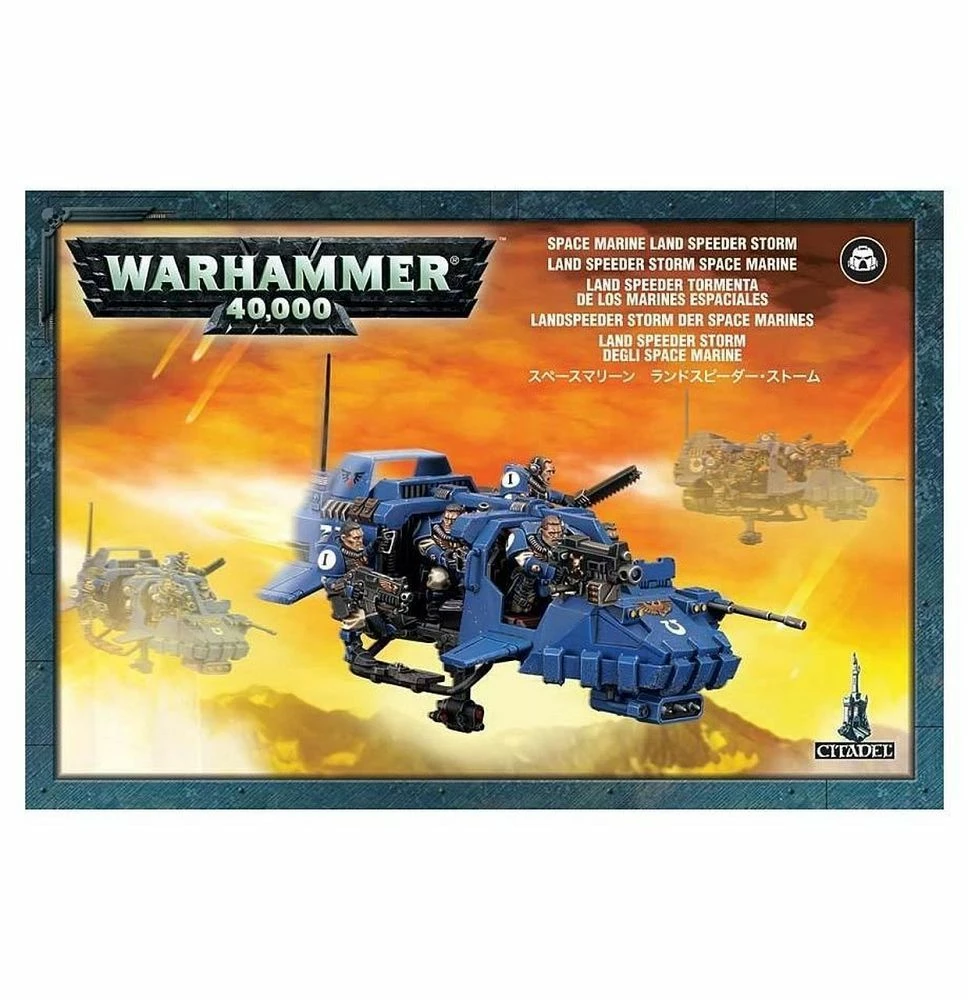 This box set contains one multi-part plastic Space Marine Land Speeder Storm and six multi-part plastic Space Marine Scouts. This 99-piece set includes: a Cerberus launcher, a heavy bolter and a range of head, weapon and arm options for the Scout crew. Also included are a host of accessories including: pouches, grenades, scopes, packs and knives. Model supplied with a large flying base.