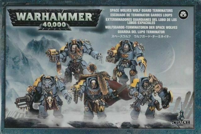 This box set contains five multi-part plastic Wolf Guard Terminators. This 100-piece set includes: five different leg variations, five torso variants and 13 different shoulder guard variants, and 13 heads. Also included are: four sets of wolf claws, an assault cannon, four thunder hammers and storm shields, a heavy flamer, five storm bolters, three power fists, two chainfists, a frost axe, and a power sword. Models are supplied with 40mm round bases.