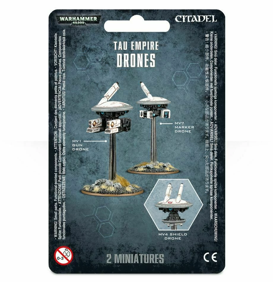 This multi-part plastic kit gives you everything you need to build two T’au Drones, highly-advanced and highly-mobile automata of the T’au Empire. You have the option of assembling any two of the following – one shield drone, one marker drone and one gun drone. Eleven components are included, with two Citadel small Flying bases.