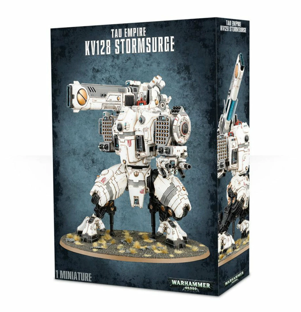 An absolute colossus of a machine, piloted by graduates of the Ves’oni’Vash, the KV128 Stormsurge is designed as an extreme heavy-weapons platform. Not as manoeuvrable as a Riptide, instead relying on thick armour and devastating loadouts, these hulking, squat ballistic suits are capable of changing the course of a battle in seconds with a decisive volley of astonishing firepower. Fitted with thrusters to counter recoil, bristling with pulse weaponry and missile pods, the Stormsurge is the T’au Empire’s Titan-killer.