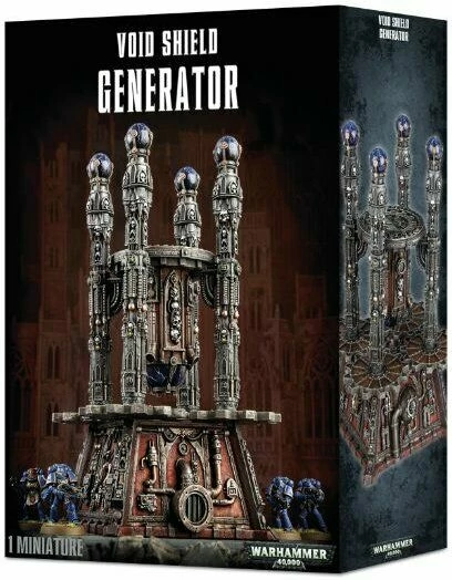 A brooding tower of pipes, cables and forgotten technology, the Void Shield Generator is the epitome of Mechanicus architecture. Able to project up to three void shields, it is an impressive defence system, aiding the warriors of the Imperium when hunkering down against alien assaults. The generator plinth houses an eclectic mix of old and new technology, from steam-driven cogs to plasma cores and beaten brass reactors, while at the corners of the structure stand four towers topped with energy globes that project the void shield around the building.