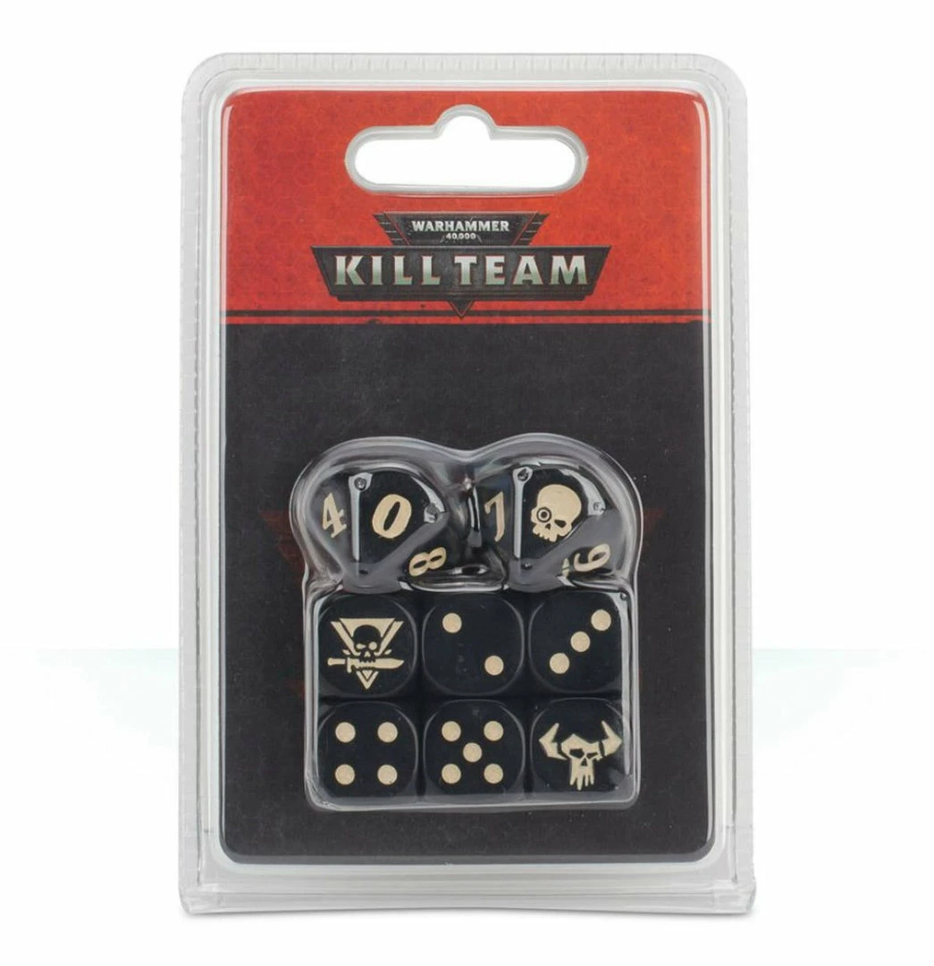 This set contains 6 6-sided dice and 2 10-sided dice – the former used during games of Kill Team, the latter used to roll on certain tables when assembling your squad ready for combat. Themed to match the Orks, these dice are black with bone-colored markings. The D6 feature an Orks icon in place of the 6 and a Kill Team logo in place of the 1; the D10 feature a skull in place of the 1.