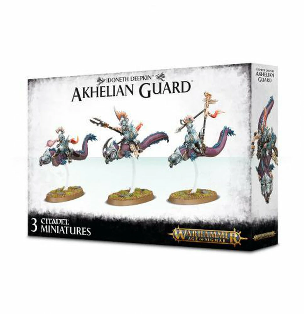 No troops exemplify the Idoneth Deepkin way of life more than the Akhelian Guard. Mounted atop Fangmora Eels, they fight in a loose formation ideal for rapid assaults and sudden retreats, typifying the hit-and-run style of war common amongst the aelves of the depths. Morrsarr Guard are armed with volt-spears and galv-shields, channeling the powerful electrical energies of their Fangmora mounts into the tips of their spears, releasing the charge as a lethal short-range bolt. Some legends tell of Morrsarr Guard formations so large that the brightness of their combined biovoltaic blasts left the entire enemy army blinded and reeling.