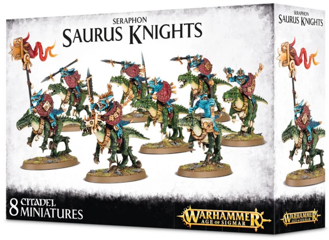 This multi-part plastic kit contains the components necessary to assemble eight Saurus Knights riding fearsome cold ones, wielding celestite lances or blades and stardrake shields. One model can be assembled as an Alpha Knight, one can be assembled as a wardrummer, and one can be assembled as an icon bearer Ninety-three components in total, with eight Citadel 60x35mm Oval bases.
