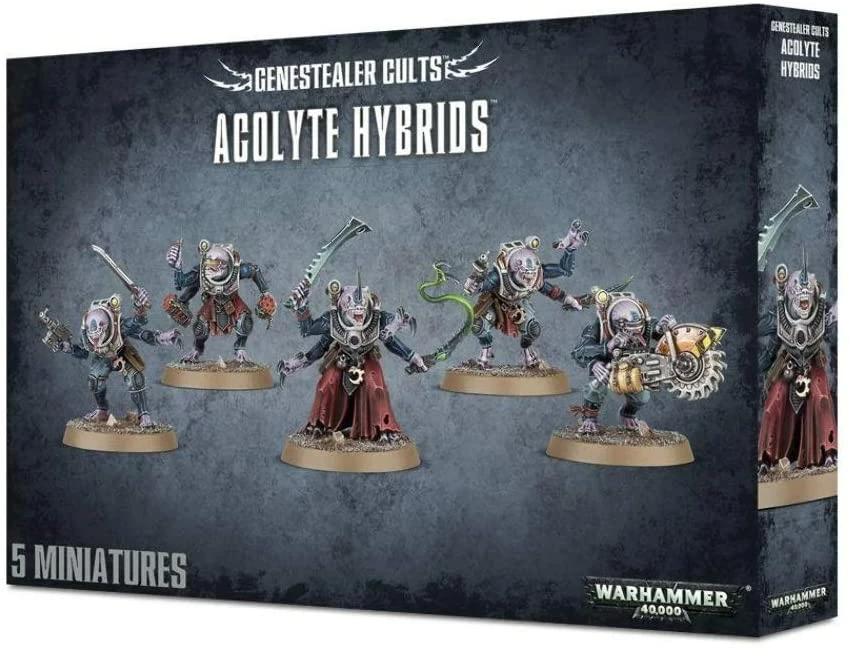Basking in the sheer alien glory of the patron that infected them, Acolyte Hybrids croon and hiss in the gloom. When the time comes to throw off the torn robes they use to disguise their foulness, the Acolyte Hybrids crawl up to the surface and into the sunlight, their grotesque faces twisted in subhuman glee. They display a bizarre blend of the species from which they hail – the speed of a Purestrain Genestealer twinned with human cunning is a potent combination. These hybrids fire off volleys of pistol fire, before descending on the enemy in a riot of claws, close combat weapons and screamed praise to their masters.