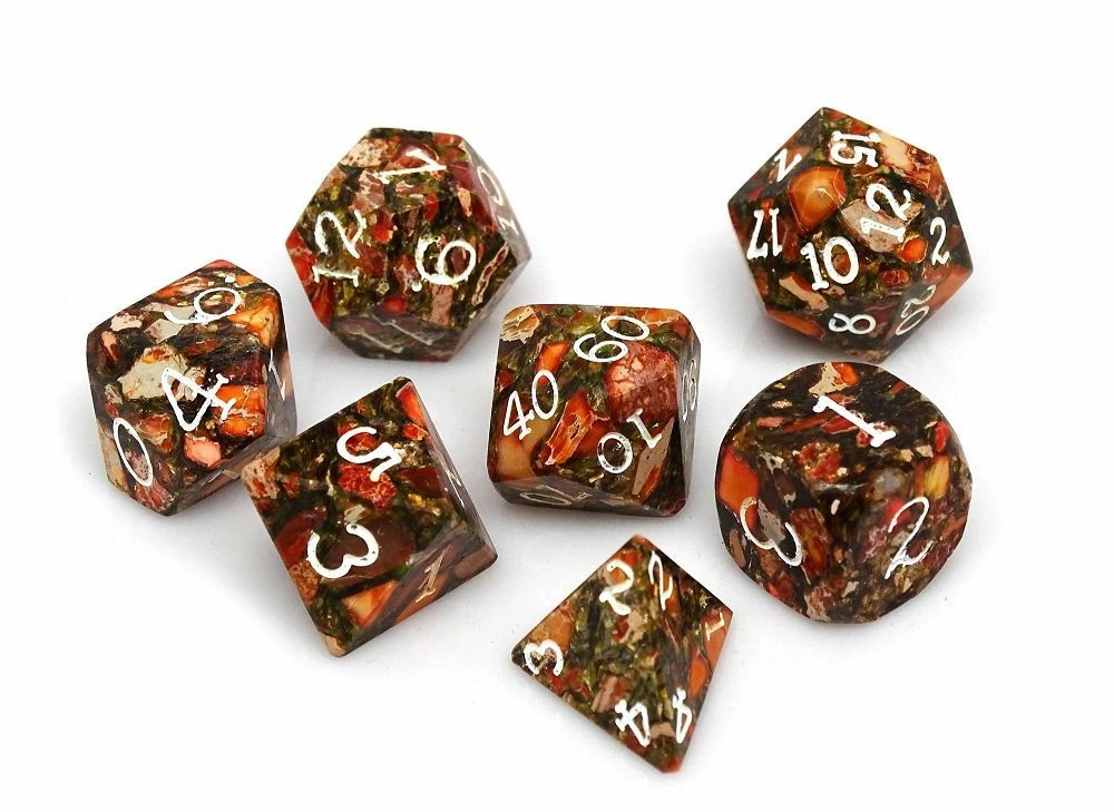 adlands is a truly beautiful set of dice! Shades of orange, brown, red, and pink are accented with white numbering and metallic flake…